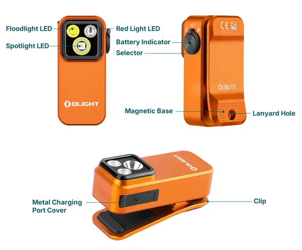Olight Oclip Pro Compact LED Clip Light with Floodlight & Spotlight & Red light - Orange